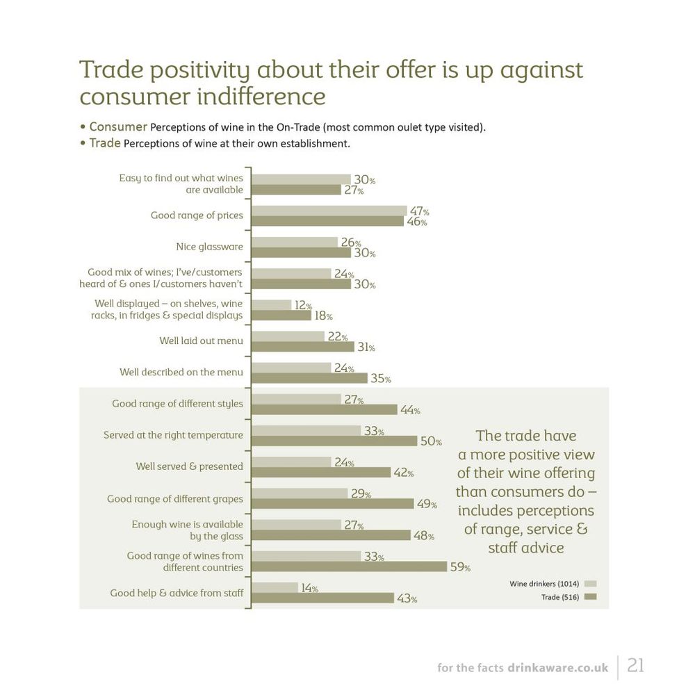 Again 42% of on-trade operators surveyed thought their wines were well served and presented, but only 24% of wine drinkers did.