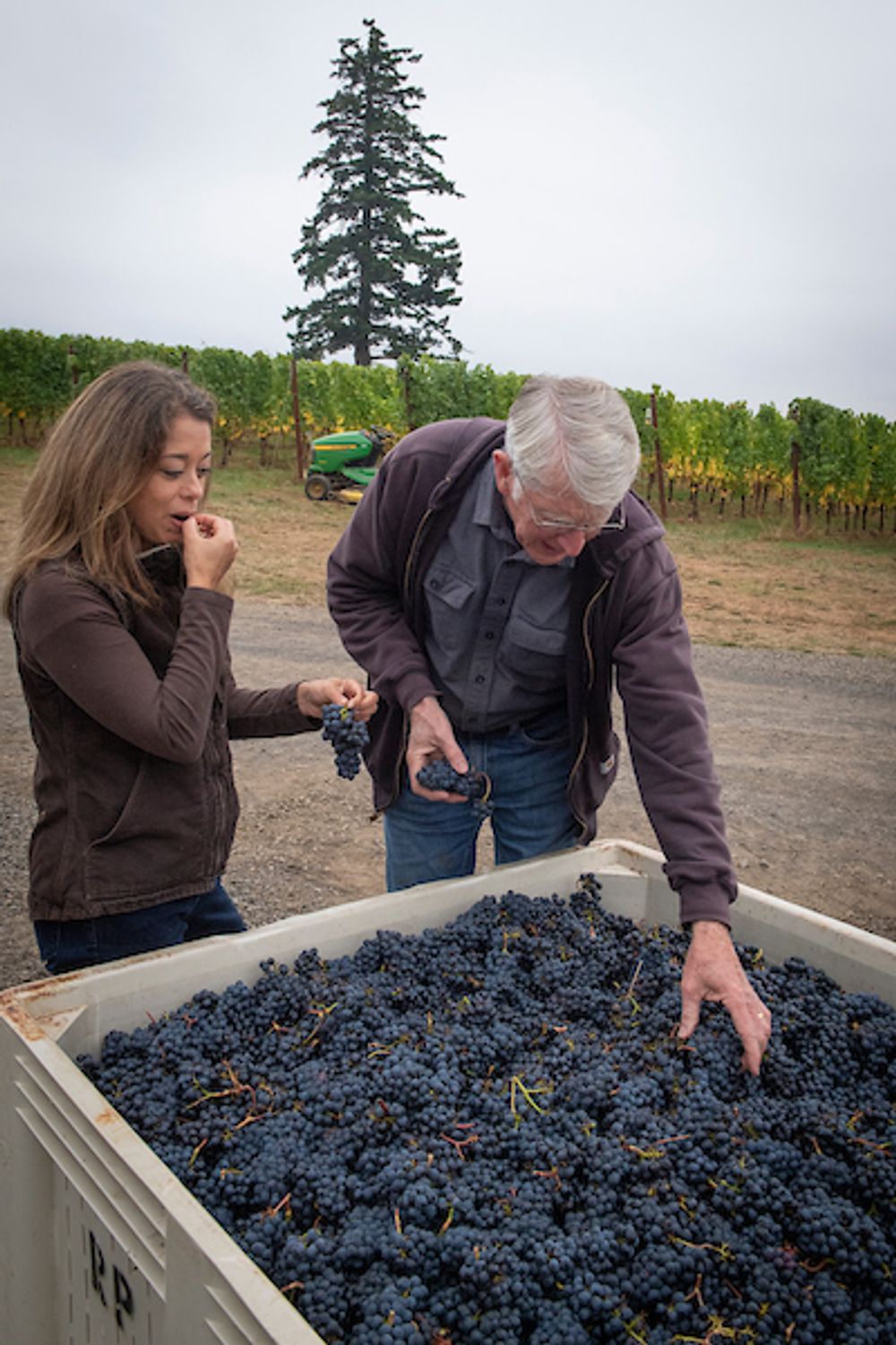 Jessica Mozeico of Et Fille Wines with Mike McNally of Fairsing Vineyard sampling Pinot Noir harvest 2018