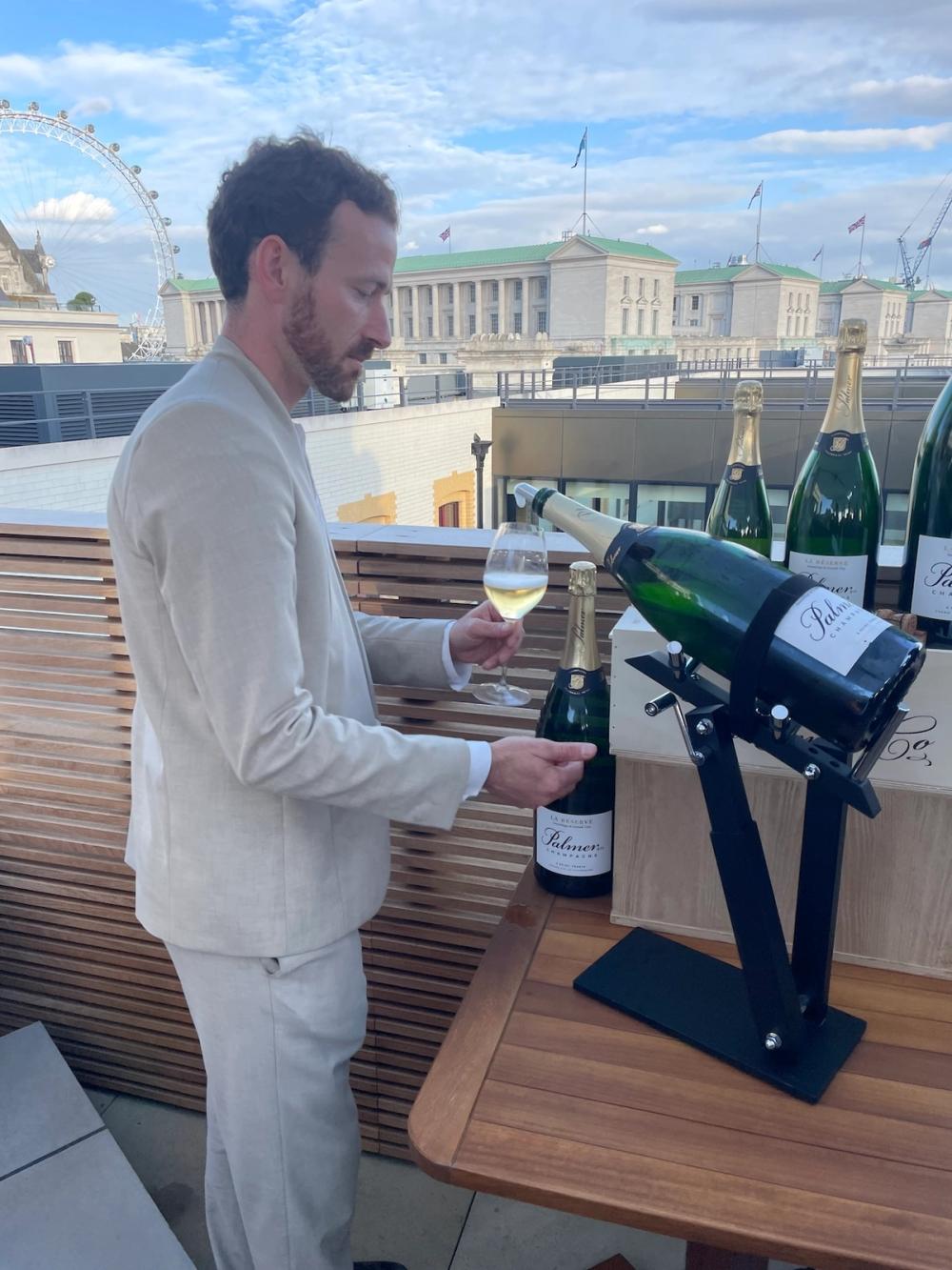 On the rooftop terrace of London’s grandly refurbished Old War Office hotel, Merlin Ramos, head sommelier at the venue’s smart restaurant, Kioku by Endo, pours from a special contraption designed for jeroboams. With its blend of tradition and innovation, OWO is an entirely appropriate place to launch Champagne Palmer & Co.’s latest offering, its first zero-dosage champagne.