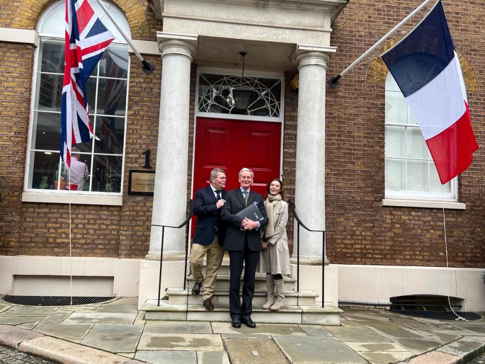 Domaine de la Romanée-Conti 2021 launch, London, February 7 2024. DRC co-directors Bertrand de Villaine and Perrine Fenal flanking Corney & Barrow MD Adam Brett-Smith