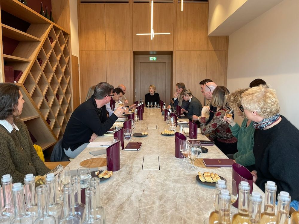 Tasting base wines from the 2023 vintage in the new tasting room overlooking the vines