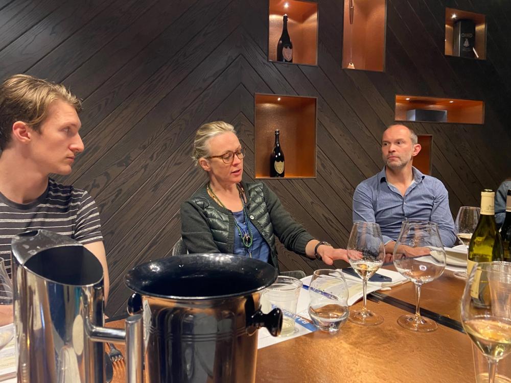 Victoria Sharples explains where she thinks there are opportunities for Beaujolais whites and Centre-Loire reds to Noble Rot’s Joshua Castle, left, and Ray O’Connor from Naked Wines, right