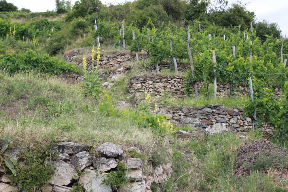 The arid slopes behind Domäne Wachau feature the stone terrace walls for which the Wachau is famous. The stones have no uniformity in size or shape, and look as if they were grabbed in desperation. Rows of vines are planted on the terraces atop the walls.