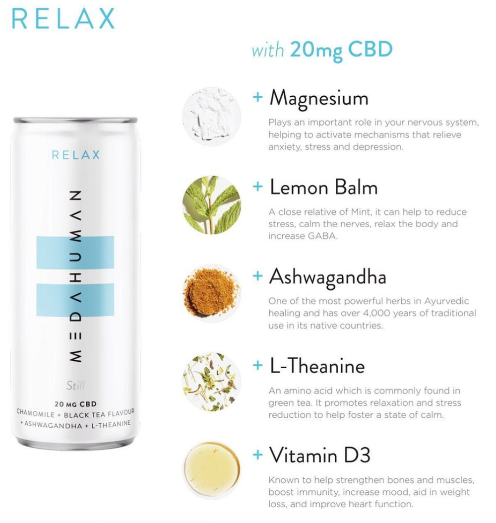 Relax – A still functional wellness drink with natural ingredients: chamomile, black tea, ashwagandha and L-theanine, carefully crafted to ensure they work synergistically with the infused 20mg of CBD.