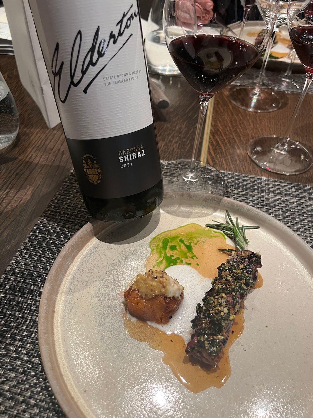 For the main course of grilled venison with celeriac puree, winter veg and a Grand Veneur sauce, ‘Mum’ accompanied ‘Dad’ so to speak with 2021 Ode to Lorraine Barossa Valley Cabernet Sauvignon Shiraz Merlot served alongside 2022 Neil Ashmead Grand Tourer Barossa Valley Shiraz.