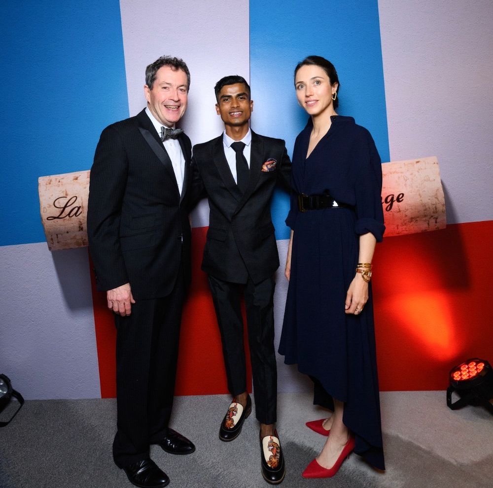 Shiva Chaurasiya with Penfolds' Peter Gago and Caroline Frey of La Chapelle in Burgundy at an event to celebrate the winemakers' joint Burgundy wine - Grange La Chapelle
