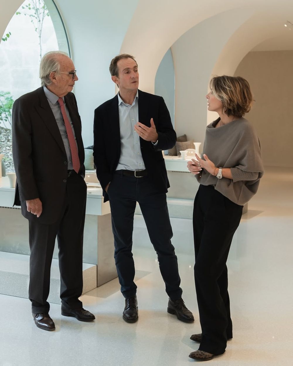 By positioning canapé stations on different floors, guests were invited to taste their way around the building, which was all curved stone edges, understated neutral tones, and elegant black detailing. It was a festive occasion, and each room felt like a gift to be unwrapped, every door an advent calendar window onto a new view, cuvée, or light bite.